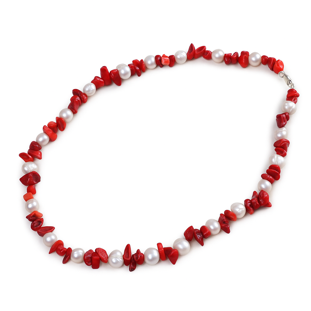 Collier de Corail Et Perle Naturel 8 mm , Longueur Du Collier 45 Cm, Fermoir En Argent 925 .